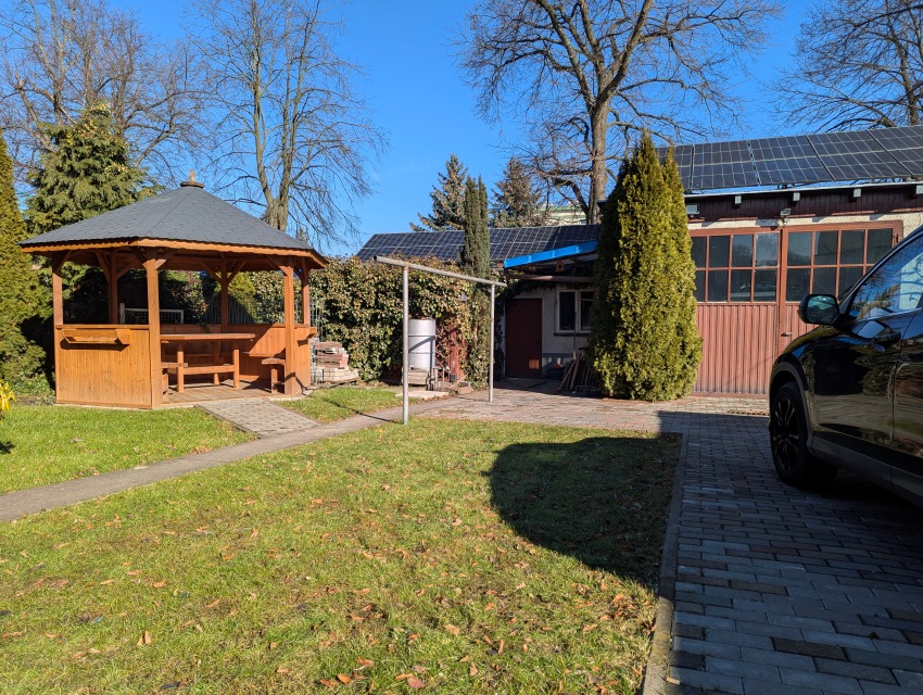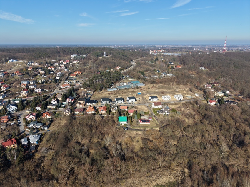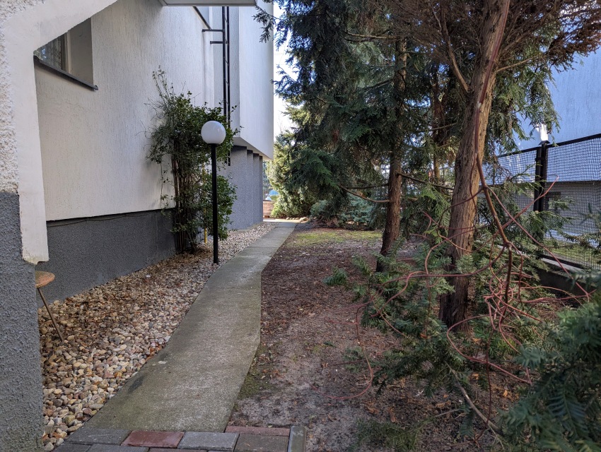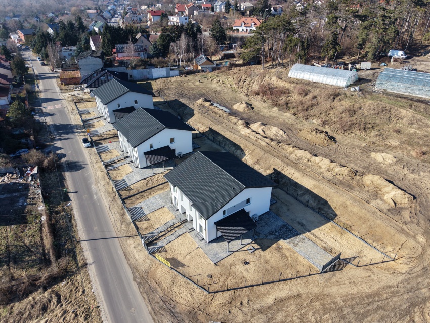 Piękna działka o powierzchni 1556 mkw, w kształcie kwadratu, o wymiarach 39,3 m x 39,5 m, z majestatycznymi sosnami, zadbanym trawnikiem, z posadzonymi kwiatami, krzewami, iglakami, teren wokół domu i podjazd do garażu wyłożony kostka brukową, ogrodzona panelami z siatki metalowej. Dojazd drogą asfaltową.