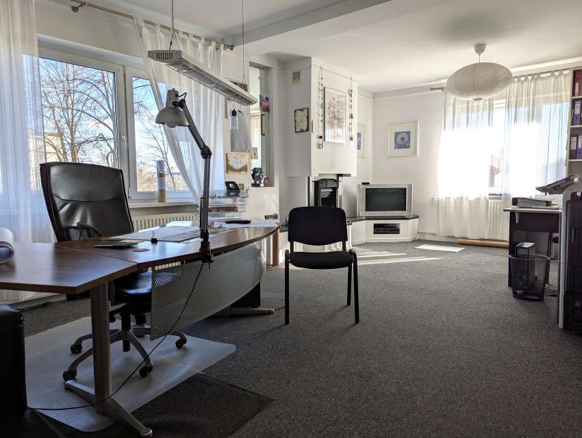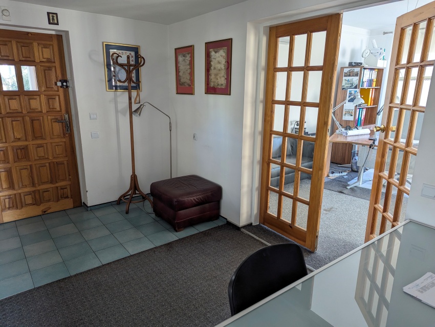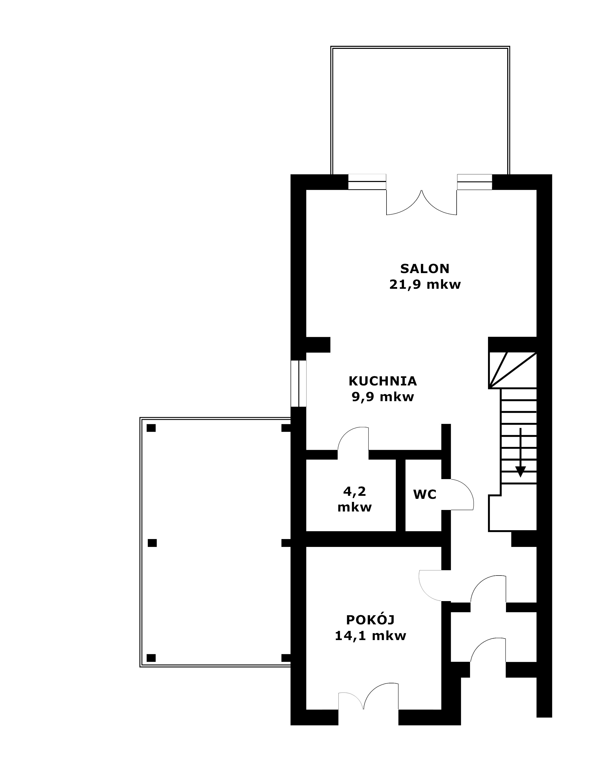 Na parterze, o wysokości pomieszczeń 2,73 m, doskonale naświetlony salon o powierzchni 38,72 mkw, z przeszkoloną w 3/4 ścianą od strony tarasu, z kominkiem, połączony z dużą - 22 mkw - kuchnią, z wyspą, na której blacie położoną mozaikę Bisazza, także z wyjściem na taras z deskami modrzewiowymi, z jadalnią, pokój 15,02 mkw, łazienka 4,71 mkw - z kabiną, muszlą, umywalką -wiatrołap, przedpokój, kotłownia, z przejściem do garażu o powierzchni 41,33 mkw, oraz, obok garażu, dwa pomieszczenia o powierzchniach 10,16 mkw i 5,34 mkw, przewidziane na ewentualny gabinet z poczekalnią dla pani lub pana domu, z wejściem z garażu i drugim, niezależnym, z zewnątrz.